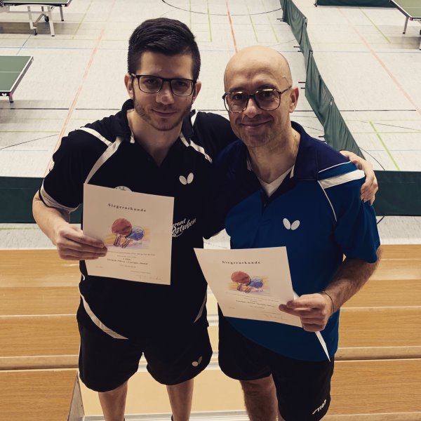 (v.l.n.r.) Oliver Sierpek und Daniel Caroppo nach ihrer Finalteilnahme in Weil der Stadt. Um in der Winterpause wertvolle Wettkampfpraxis zu sammeln, nahmen einige unserer aktiven Spieler an diversen Turnieren teil. Den Beginn machten Patrick Stelzl und Oliver Sierpek noch im alten Kalenderjahr mit zwei Turnierteilnahmen. Am zweiten Weihnachtsfeiertag machten sich Patrick und Oliver auf nach Schwäbisch Gmünd und konnten mit den dort gezeigten Leistungen zufrieden sein. Zwei Tage später nahmen die Zwei spontan auch noch an einem 2er-Mannschaftsturnier 30 Kilometer südlich von Augsburg teil – leider wenig erfolgreich. Das erste Turnier im neuen Jahr fand in Ettlingen statt. Beim bundesoffenen Turnier gingen insgesamt zwölf Teilnehmer des TTCB an den Start, darunter drei Nachwuchstalente aus unserer Jugendabteilung,die mit ihren Leistungen überzeugen konnten. Die Erwachsenen dagegen hatten etwas mehr zu kämpfen und so schied der Großteil bereits in der Vorrunde aus. Erfolgreichster Akteur war Florian Atlas: Er spielte ein starkes Turnier und scheiterte erst im Viertelfinale in der Herren C-Konkurrenz. Im Doppel der Herren C schafften es Daniel Caroppo und Oliver Sierpek auf das Siegertreppchen. Sie erreichten den zweiten Platz und scheiterten erst im Endspiel unglücklich an ihren Gegnern. Auch beim traditionellen 2er-Mannschaftsturnier in Weil der Stadt nahm eine motivierte Truppe teil. Insgesamt konnten die Veranstalter dort über 400 Teilnehmer begrüßen, darunter auch 13 Aktive und Jugendliche vom TTCB. Daniel und Oliver, die sich in einem Feld von 45 Mannschaften bis ins Finale durchspielten, erreichten in der Herren B-Konkurrenz erneut einen sensationellen zweiten Platz. |