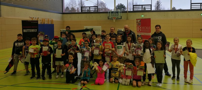 Die begeisterten Kids und das Organisationsteam nach der Siegerehrung Am vergangenen Freitag fanden in der Hermann-Gross Sporthalle die diesjährigen Minimeisterschaften statt. Die insgesamt 39 Mädchen und Jungs traten in je drei Altersklassen an und konnten sich für den Kreisentscheid im März in Egenhausen qualifizieren. Eltern, Lehrer und die Organisatoren des TTC Birkenfeld konnten einmal mehr faire Spiele und tolle Ballwechsel bei den Kids beobachten, die trotz der ein oder anderen Träne alle mit Spaß dabei waren. Auch der Jugendleiter des TTC Birkenfeld und Cheforganisator Oliver Sierpek war von der Veranstaltung angetan: „Wir freuen uns, dass wir wieder steigende Teilnehmerzahlen vermelden und so mehr Kindern Spaß am Tischtennis vermitteln können. Natürlich freuen wir uns auch immer über Zulauf an unseren Trainingstagen oder in unserer Schul-AG an der LUS.“ (Info über: oliver.sierpek@ttcb.de) Besonders bedanken möchte sich der Jugendleiter auch bei unseren Jugendspielern Maximilian und Mathis, die das Organisationsteam tatkräftig unterstützten und am Ende sogar zusammen die Siegerehrung durchführten. Ein großes Dankeschön gilt auch Frau Hildebrand, die sich von Schulseite um Anmeldungen und die Beschaffungen von Sachpreisen gekümmert hatte, ohne die langjährige und hervorragende Zusammenarbeit mit ihr wäre dieses Turnier nicht möglich. |