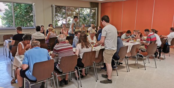 Die TTC-Bruncher genießen das Beisammensein bei tropischen Temperaturen Zwei Tage später fand – ebenfalls im Vereinsraum – ein Brunch für die TTC-Familie statt. Bewirtet von den Schwarzwaldstuben trafen sich insgesamt ca. 40 TTC-Mitglieder, deren Familien und Freunde. Trotz hoher Temperaturen machten es sich die Anwesenden gemütlich und ließen es sich gut gehen. Der Chef der Schwarzwaldstuben, Emmanuel Sekulla, verwöhnte die Gäste mit seinem allseits bekannten, kulinarischen Können und ließ keine Wünsche offen. Nach der Wanderung auf die Grünhütte an Pfingsten war dies nun schon die zweite Familienveranstaltung nach der Saison. Wir hoffen, dass alle Anwesenden ihren Spaß hatten und wir weiter zum Zusammenhalt im Verein beitragen konnten. |