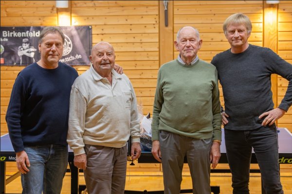 In diesem Jahr fand unsere Weihnachtsfeier im Franziskushaus neben der katholischen Kirche statt. Das Programm begann mit einer herzlichen Begrüßung, gefolgt von einem Tischtennisturnier. Jedoch wurde hier nicht mit herkömmlichen Schlägern, sondern mit Serviertellern gespielt. Das Gauditurnier zog sowohl aktive Spieler als auch Nichtaktive, unsere Jugendliche und ihre Eltern gleichermaßen an. Im Finale des Turniers setzte sich Daniel Forstner gegen Karl Felger durch und sicherte sich somit den Turniersieg. Der Höhepunkt des Abends war jedoch zweifellos der Teil, der dem 70-jährigen Bestehen des Tischtennisclubs Birkenfeld gewidmet war. Gründungsmitglieder Erich Höll und Peter Ölschläger wurden von Urs Fingberg für ihre weise Entscheidung gelobt, einen eigenständigen Verein zu gründen, anstatt eine Abteilung eines anderen Vereins zu werden. Als Anerkennung erhielten beide von Frank Ehmer, dem 2. Vorstand, Geschenkkörbe überreicht. Peter erhielt zusätzlich Golfbälle für seinen aktuellen Sport und einen Tischtennisball, um ihn an seine "sportlichen Wurzeln" zu erinnern, in der Hoffnung, dass er mal wieder zu uns in die Halle kommt. Urs Fingberg sorgte für Spannung, als er die Vereinsmeister auflistete, die fünf-, sechs- und siebenmal erfolgreich waren. Doch es gab einen, der mit erstaunlichen zwölf Erfolgen herausragte. In diesem Jubiläumsjahr, in dem er auch sein 30-jähriges Jubiläum als 1. Vorsitzender feierte, wurde Jürgen Haaser für seine langjährige und herausragende Mitgliedschaft im Verein geehrt. Nach den Ehrungen wurde das Buffet für die rund 80 Mitglieder eröffnet, bei dem Maultaschen mit selbstgemachten Salaten serviert wurden. Anschließend führte Jugendleiter Oliver Sierpek die Geschenkübergabe für die jugendlichen Mitglieder durch, bevor der restliche Abend in ausgelassener Stimmung ausklang. Frank Ehmer, Gründungsmitglieder Erich Höll und Peter Ölschläger, Urs Fingberg |